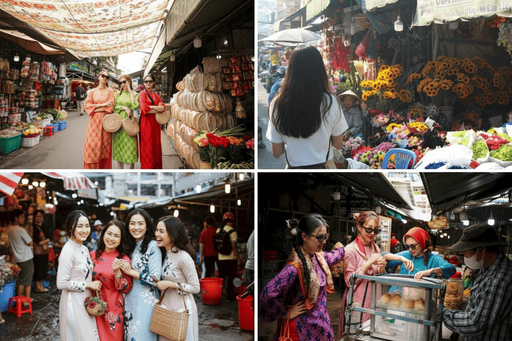 Chợ Bến Thành không chỉ là biểu tượng của thành phố mà còn là một background Tết đậm chất Sài Gòn. Với các tiểu cảnh Tết, đèn lồng, hoa và đồ trang trí, nơi này tạo nên những bức ảnh hòa quyện giữa truyền thống và hiện đại.